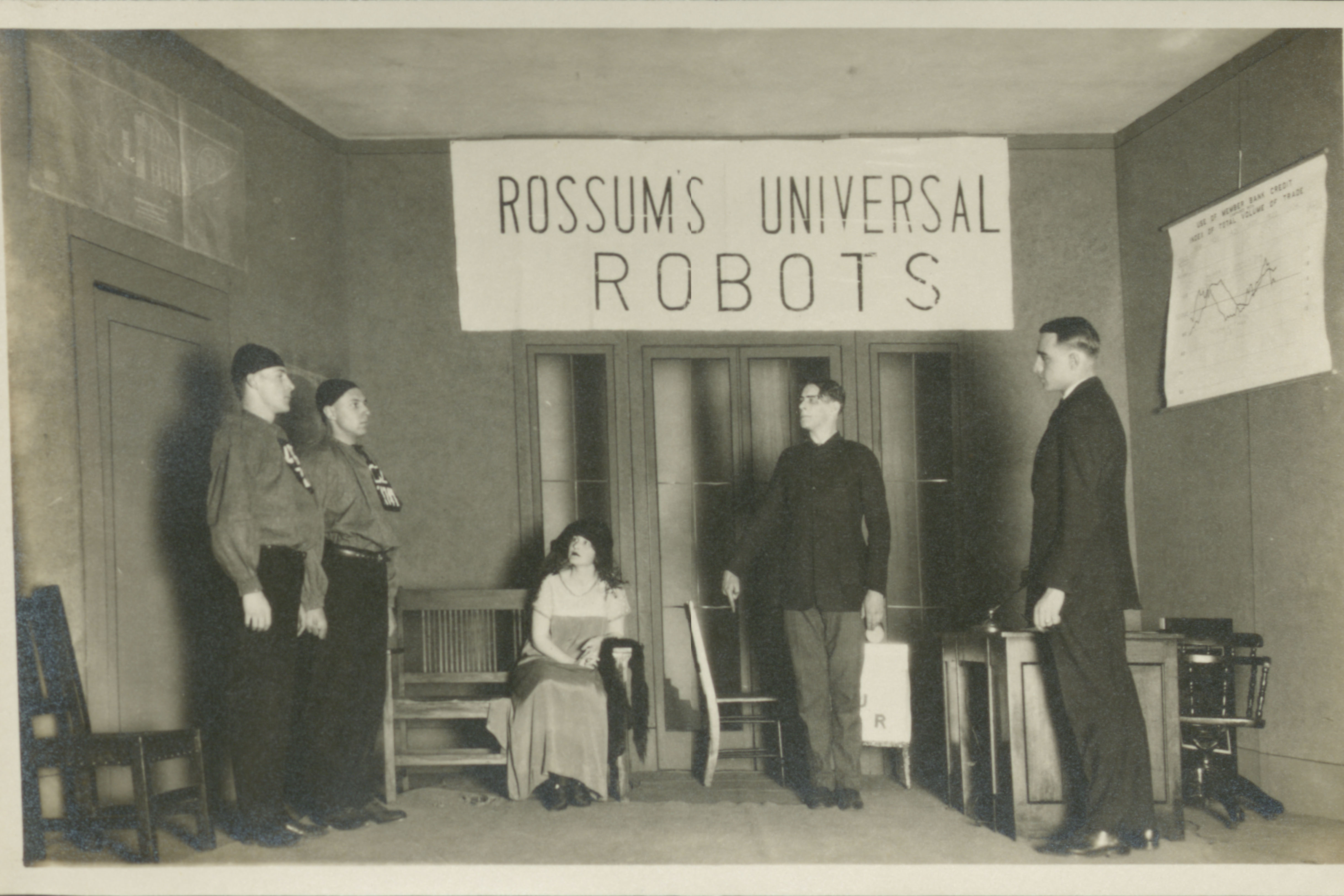 In 1920 playwright Karel Capek published his play Rossumovi Univerzální Roboti, or as it was titled in English: Rossum’s Universal Robots (R.U.R.). First staged in Prague in 1921, R.U.R. had its American premiere on Broadway in the fall of 1921. Two years later, Tufts’ own Paint, Pen, and Pretzels (colloquially known as the 3Ps), under the direction of Professor Albert Gilmer, held auditions for their own production of R.U.R.